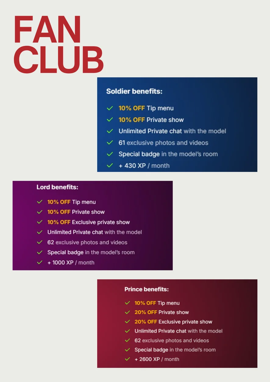 Magassarkú, Jelmez, Nejlon, Latex, Mocskos beszéd, Jóga, Farok értékelés, Lábfétis, Fenekelés, Felcsúszott szoknya, Megalázás, Olajozás, Félmeztelen, Bőr, Lovaglás, Twerk, Villantás, Tevepata, Maszturbálás, Felszarvazott, Sztriptíz, Erotikus tánc, Orgazmus, Szerepjáték, Szopás, Kutyapóz, Kiverési utasítások, Úrnők, Lábmunka, Cici baszós